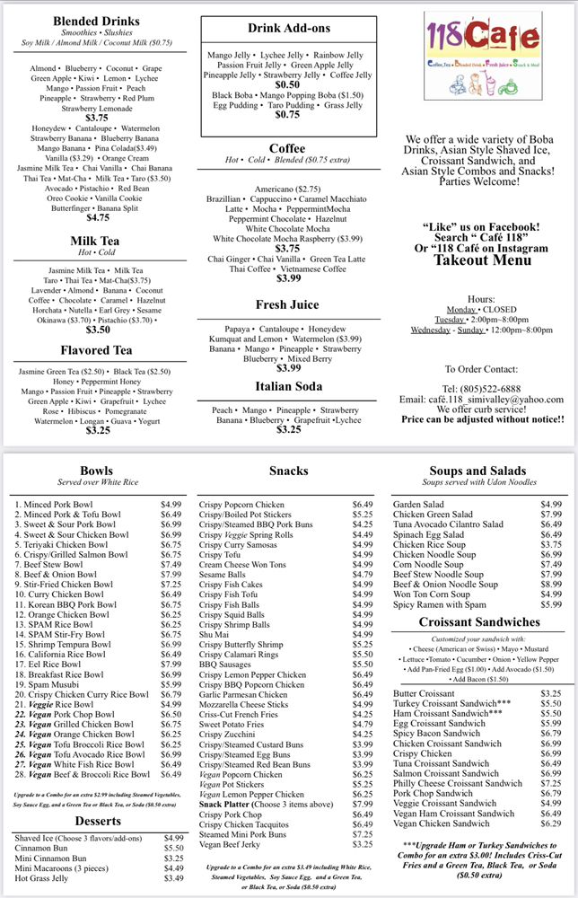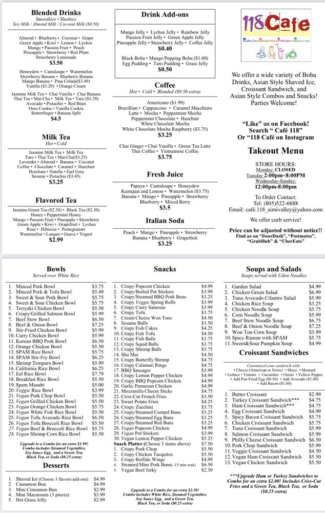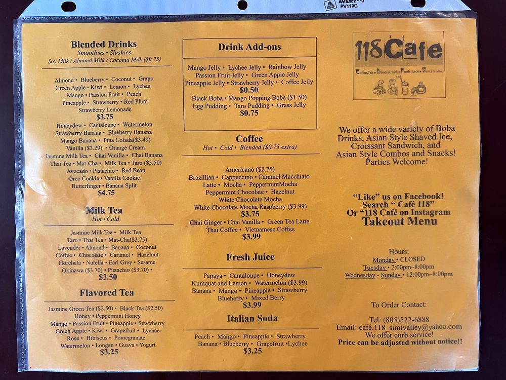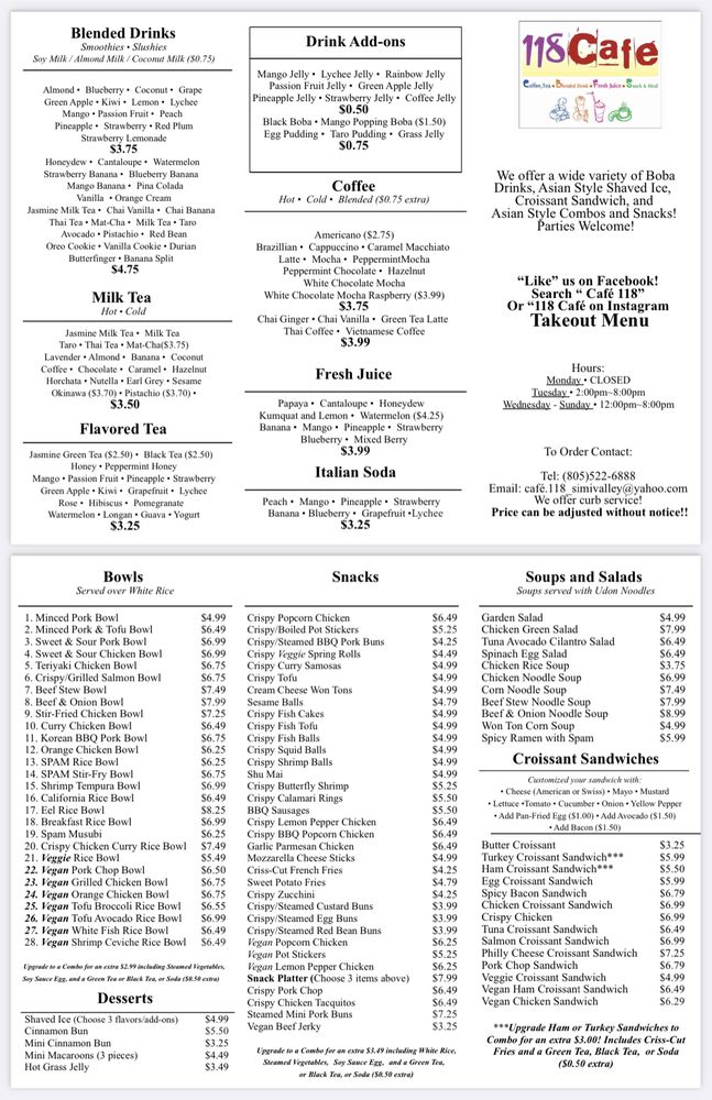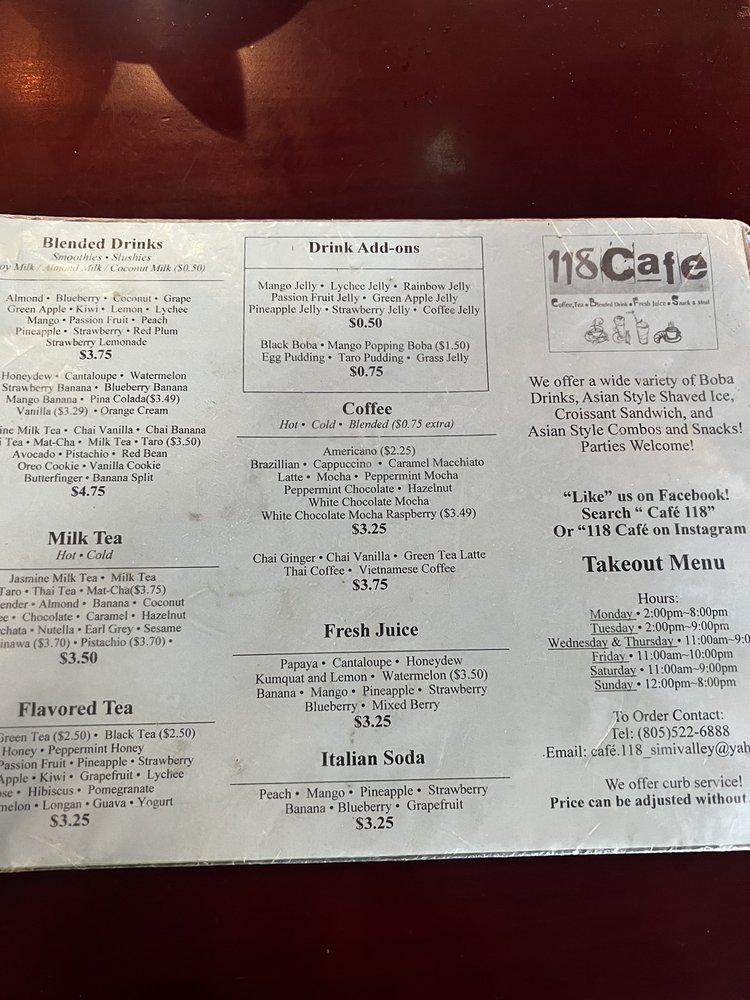 Located in Simi Valley, CA, 118 Cafe is a hidden gem for Asian Fusion cuisine. Offering a diverse menu with options for vegans and vegetarians, this cafe provides a unique dining experience. From crispy popcorn chicken to teriyaki chicken bowls, there's something for everyone to enjoy. Customer reviews rave about the friendly staff, speedy service, and delicious boba teas. The cozy atmosphere with couches and WiFi make it a perfect spot for studying or meeting friends. With a focus on providing excellent service and a wide range of food choices, 118 Cafe stands out for its quality and affordability. Don't miss out on trying their signature dishes and discovering the charm of this local cafe.